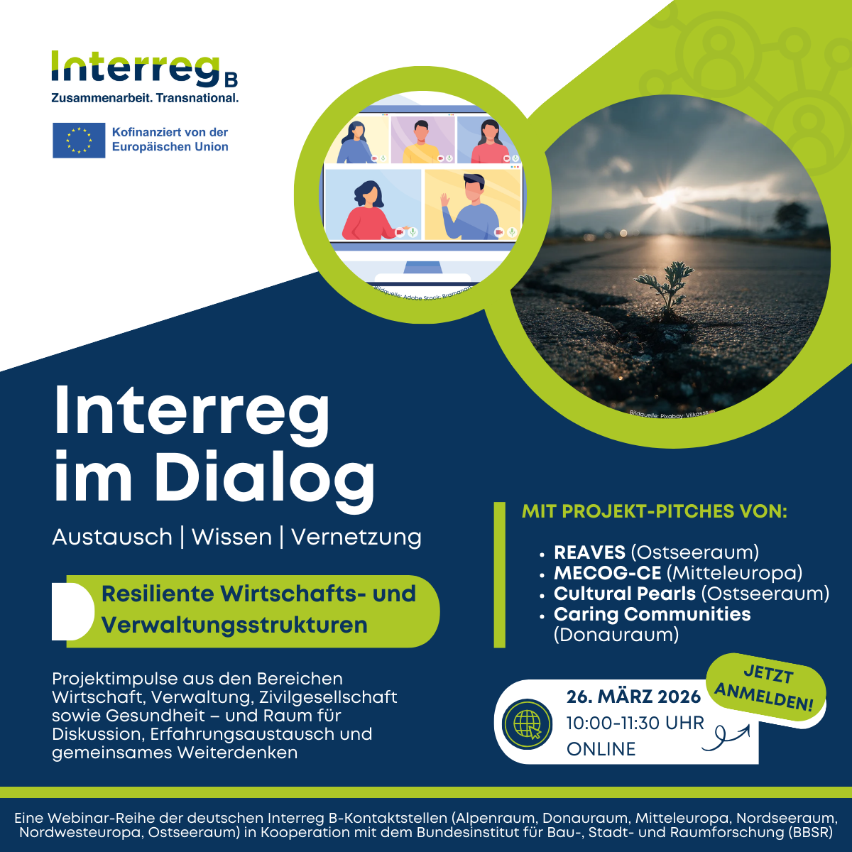 Mit der neuen Webinar-Reihe „Interreg im Dialog – Austausch | Wissen | Vernetzung“ schaffen die deutschen Interreg B-Kontaktstellen gemeinsam mit dem Bundesinstitut für Bau-, Stadt- und Raumforschung (BBSR) eine Plattform für den programmübergreifenden Austausch und laden Sie am 26. März 2026 von 10:00 bis 11:30 Uhr herzlich dazu ein. Im ersten Webinar steht das Thema „Resiliente Wirtschafts- und Verwaltungsstrukturen“ im Mittelpunkt.